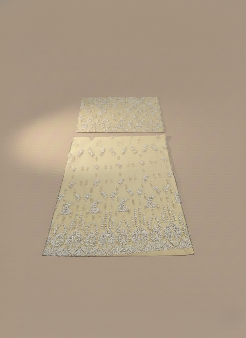 Embrace timeless elegance with this luxurious unstitched ensemble, meticulously crafted for formal events and celebrations. This sophisticated garment features pristine white embroidery and shimmering beadwork on a beautiful pale yellow net base, providing a regal and ethereal appeal. Every piece is designed to create a flawless, custom-tailored outfit.