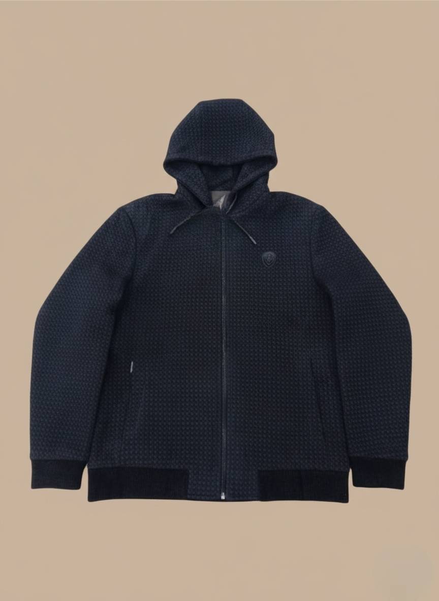 Men’s Black Hooded Quilted Jacket – Textured Knit Full-Zip Style