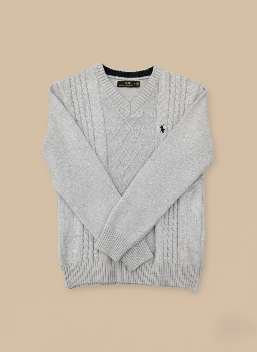 Men’s Cable Knit Sweater – Grey V-Neck Pullover with Embroidered Logo