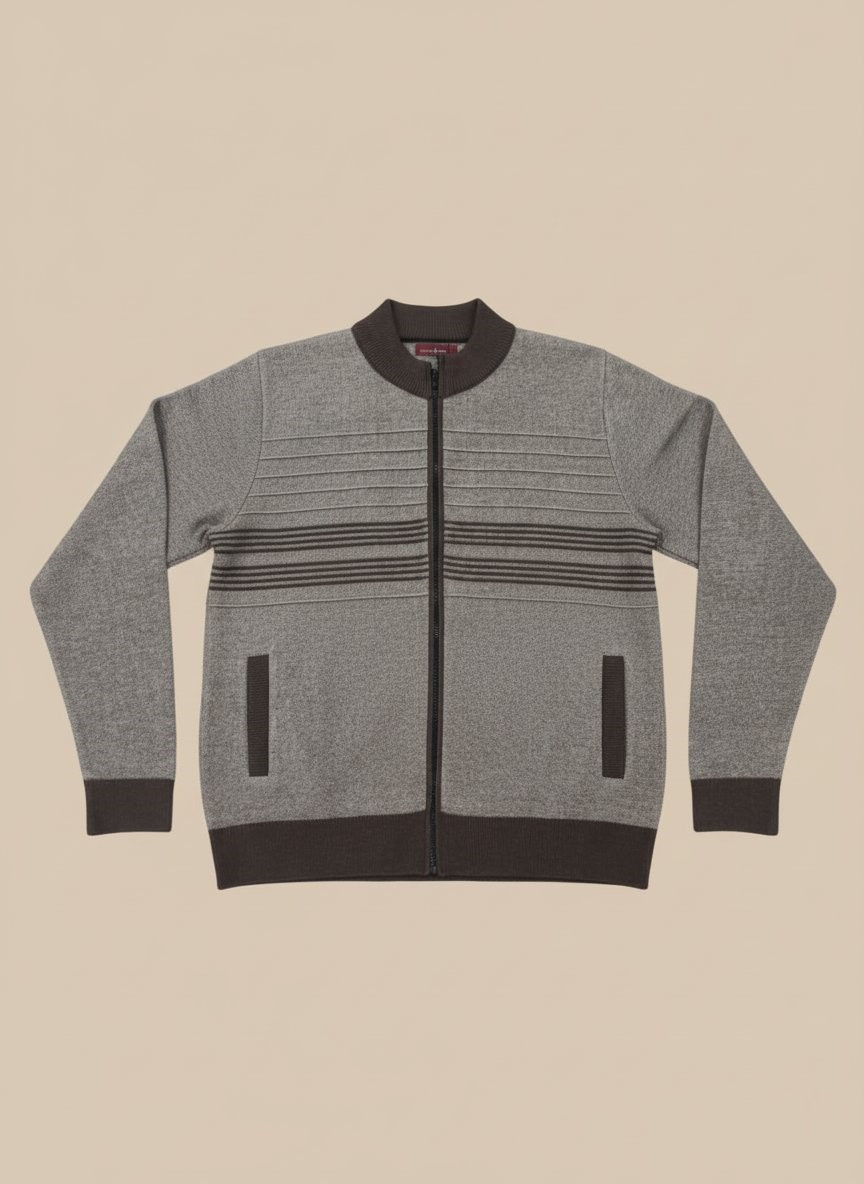 Step out in style and comfort with our Men’s Grey Full Zip Sweater, a perfect blend of modern design and cozy warmth. This versatile full-zip sweater features subtle dark brown horizontal stripes across the chest, adding a touch of sophisticated detail. Crafted for both durability and softness, it’s an ideal choice for everyday wear, whether you’re heading to the office or enjoying a casual weekend outing. The full-zip closure allows for easy layering and adjustable warmth, making this men’s grey full zip sweater a must-have in your wardrobe. It also includes two practical front pockets, perfect for keeping your hands warm or storing small essentials. Pair this stylish piece with jeans for a relaxed look or over a collared shirt for a smart-casual ensemble. Experience ultimate comfort and effortless style with this essential men’s grey full zip sweater.