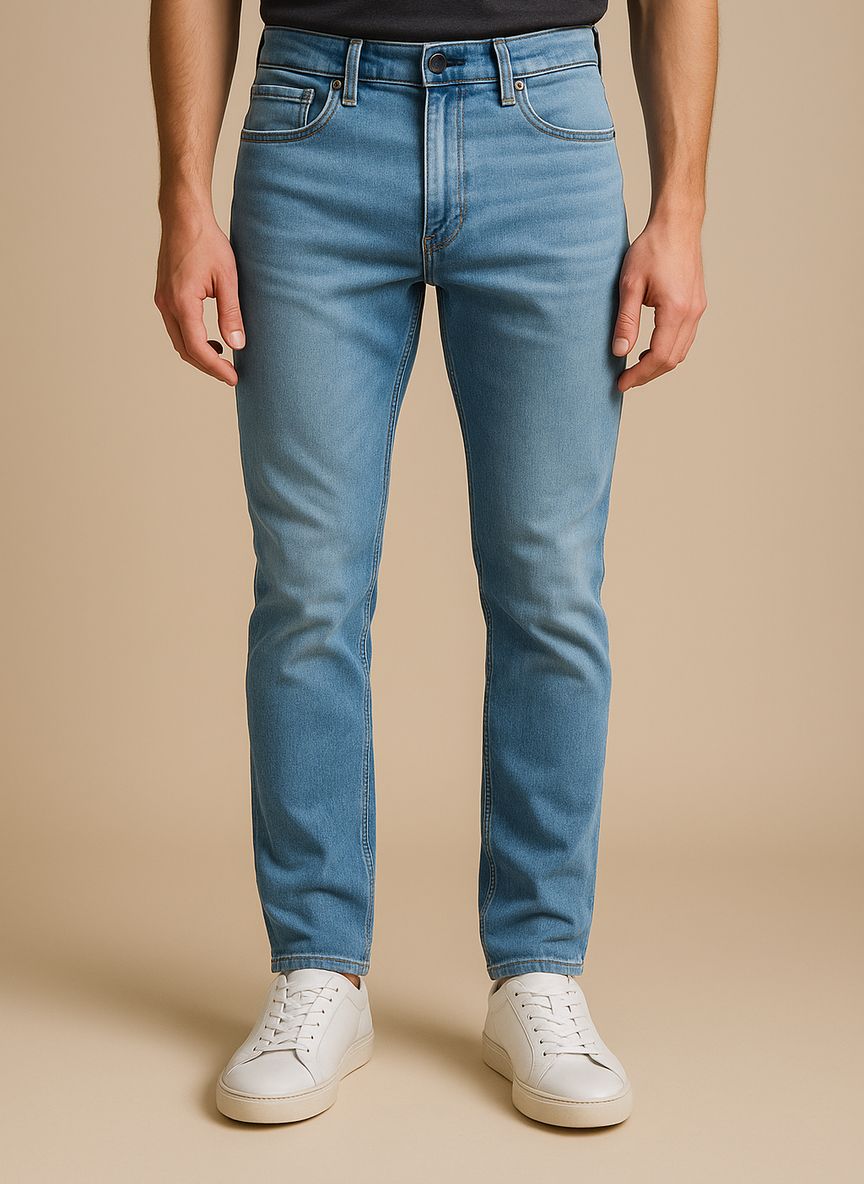 Light blue, regular fit jeans. The jeans have a classic five-pocket design and a mid-wash finish. , which complement the casual yet refined look of the denim.