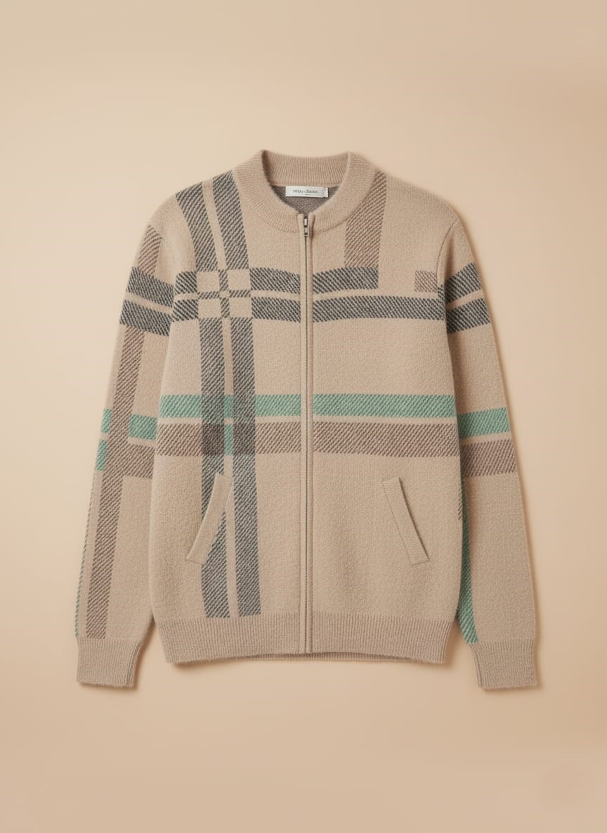 Step out in timeless style with our Men’s Plaid Full Zip Sweater. This refined beige knit sweater is designed for the modern gentleman who values both comfort and a classic aesthetic. Crafted from a soft, premium knit fabric, it offers warmth and a luxurious feel, making it an ideal choice for cooler seasons. The distinguishing feature of this men’s plaid sweater is its elegant horizontal stripe pattern, which creates a sophisticated and versatile design. The interplay of colors within the plaid adds depth and visual interest without being overpowering.