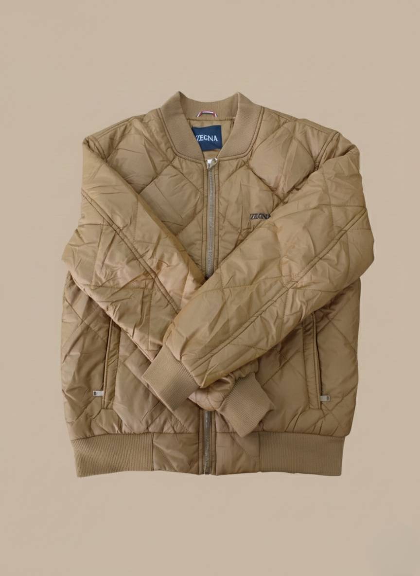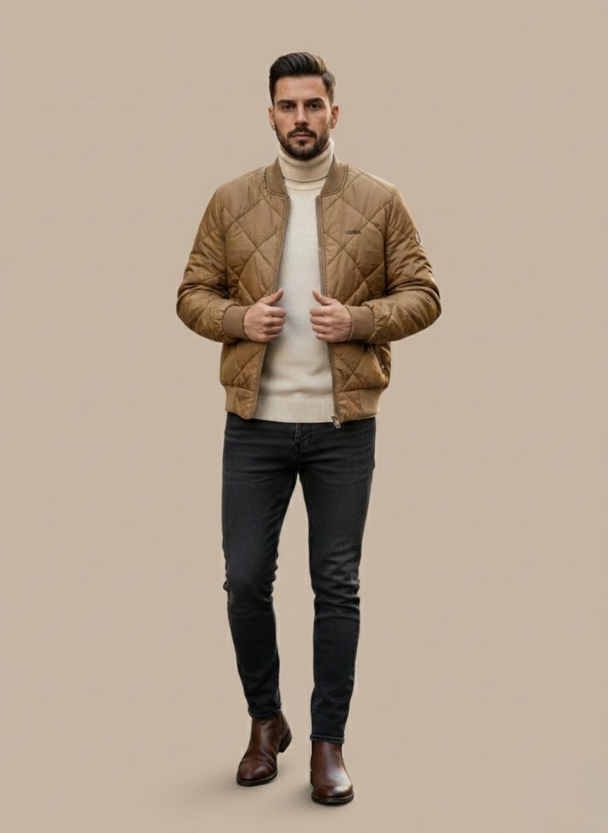 Men’s Quilted Bomber Jacket. Designed for comfort and style, this lightweight brown jacket features a signature diamond-quilted pattern that provides subtle texture and insulation without the bulk. The classic bomber silhouette includes a ribbed collar, cuffs, and hem for a comfortable, secure fit. A sturdy full-zip closure and two discreet side pockets add to its functionality.