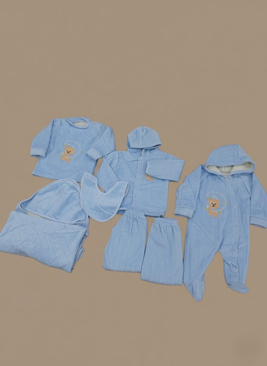 Adorable 7-piece newborn baby blue teddy bear outfit set made from soft cotton. Includes a sleeper, top, jacket, pants, bib, and swaddle blanket for ultimate comfort and cuteness.