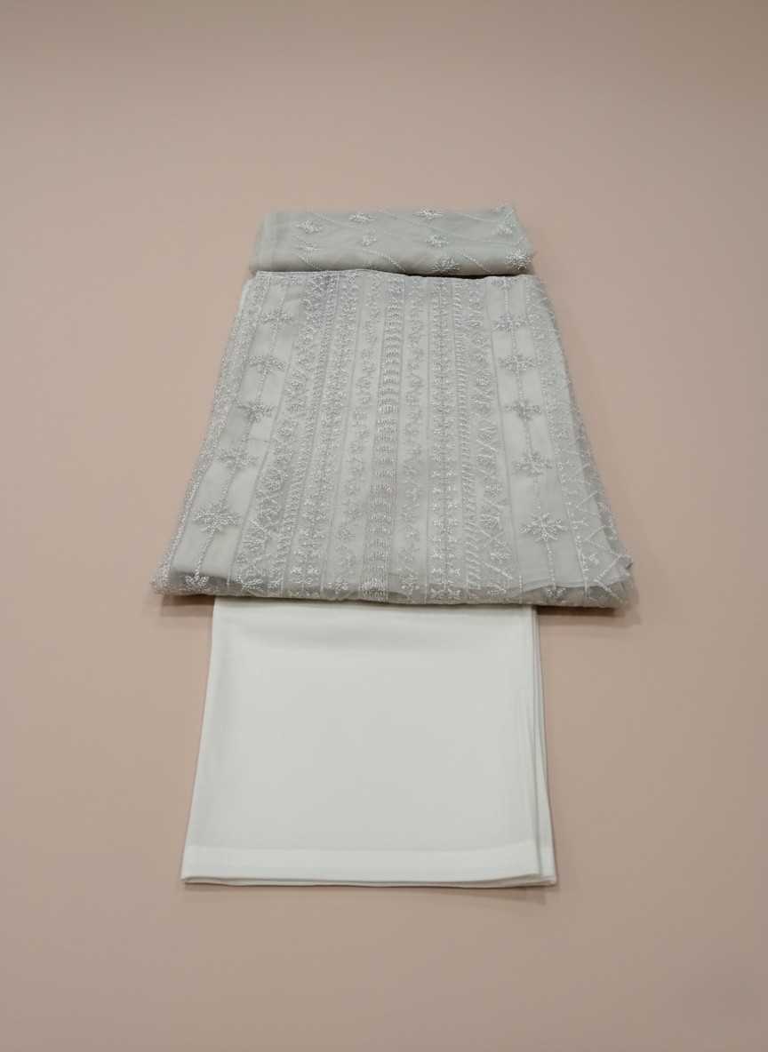 Step into regal elegance with the NUREH The Royal Palace NL-42 Carmela Unstitched Luxury Formals Embroidered Organza Suit. This breathtaking three-piece ensemble is a masterpiece of design, featuring an intricately embroidered and hand-work embellished organza front body and front panels. The delicate embroidered silk neck patch and embroidered and embellished front and back borders add a touch of refined luxury. The sleeves are hand-work embellished with mukesh work, ensuring every detail shimmers. The outfit includes a raw silk dyed inner for comfort and a grand embroidered organza zari dupatta with two side borders and two silk 4 side pattis, creating a majestic drape. Completing the look is a dyed raw silk trouser with an embroidered patch. This Unstitched Luxury Formals suit is perfect for weddings, formal galas, and special occasions where you want to make an unforgettable statement with its opulent charm and exquisite craftsmanship