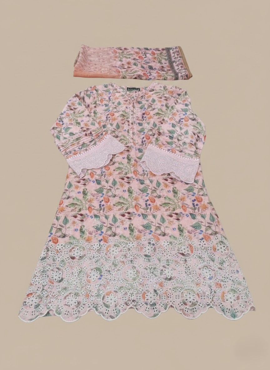 Step into elegance with our exquisite Pink Floral Embroidered Lawn Suit, a must-have 3-piece unstitched ensemble designed for the modern woman. This stunning lawn suit features a beautiful all-over floral print in soft, appealing hues of pink, complemented by intricate white cutwork embroidery along the hemline and sleeves. The delicate embroidery adds a touch of sophistication and charm, making it perfect for both casual gatherings and festive occasions. The breathable lawn fabric ensures comfort throughout the day, while the versatile unstitched design allows for personalized tailoring to your perfect fit. This collection includes a printed lawn shirt, a matching printed dupatta with a subtle border, and plain trousers (not shown but implied for a 3-piece suit). Elevate your summer wardrobe with this vibrant and stylish Pink Floral Embroidered Lawn Suit, a true blend of tradition and contemporary fashion.