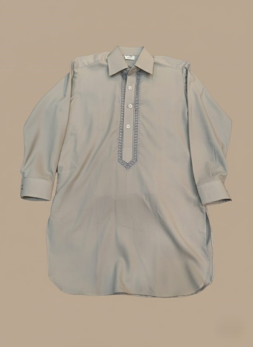 A classic boys grey kameez featuring soft fabric, elegant embroidery, and a polished traditional design—perfect for festive and formal occasions.