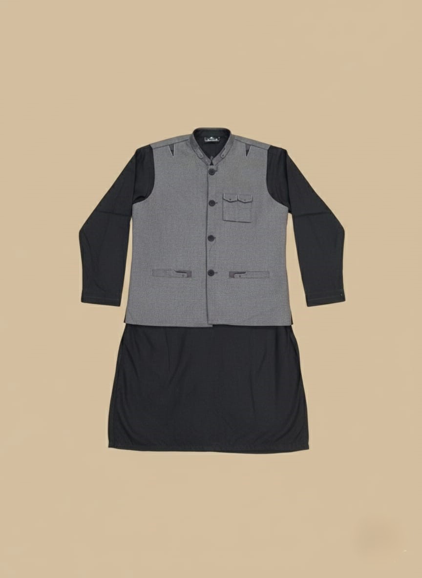 Stylish black boys kurta waistcoat set paired with a sharp grey waistcoat—perfect for festive and formal events.