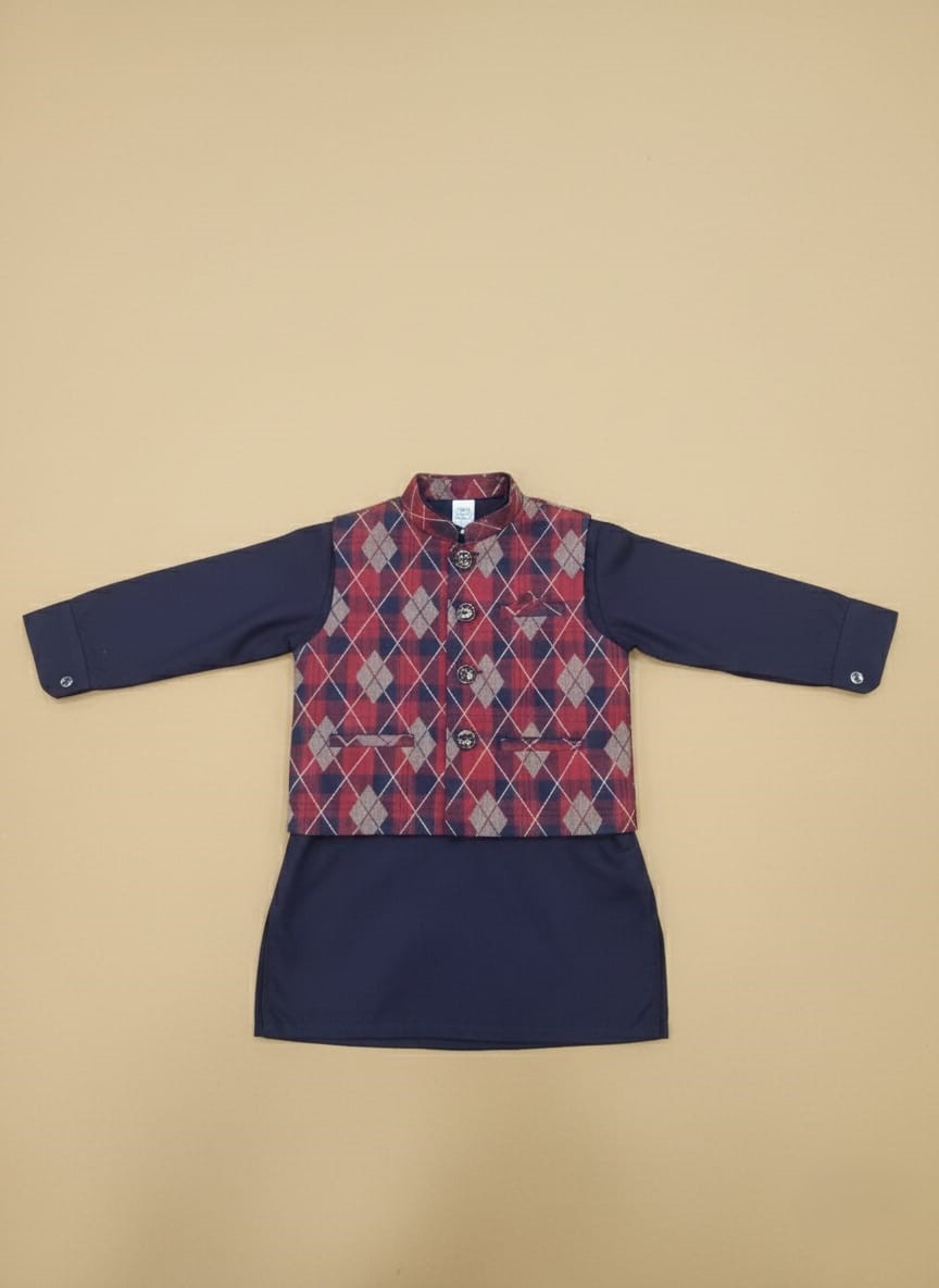 Stylish navy boys kurta waistcoat set featuring a navy kurta paired with a maroon argyle waistcoat—perfect for festive and formal occasions.