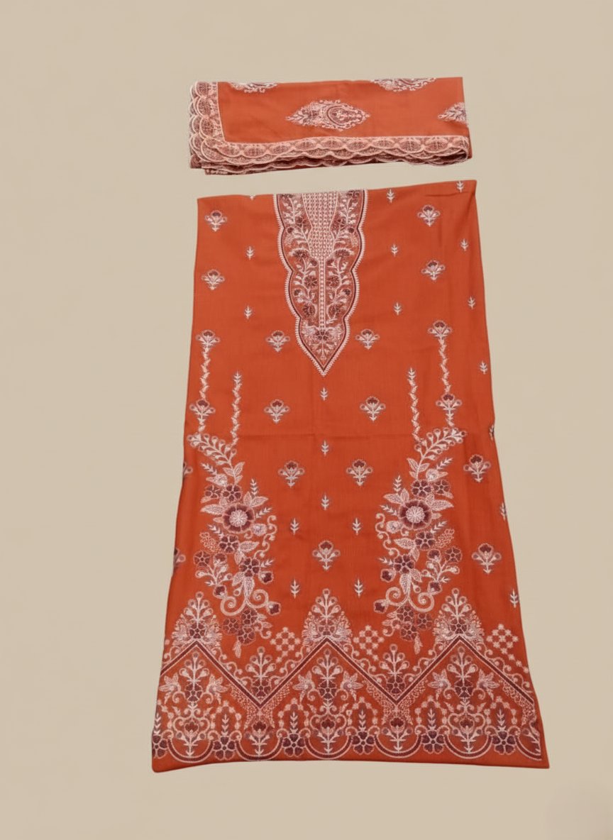 Stay warm and stylish this winter with our Premium dhanak 3 Piece Unstitched Suit. Featuring intricate embroidery on vibrant orange dhanak fabric, this set includes a shirt, trouser, and dupatta, perfect for custom tailoring.