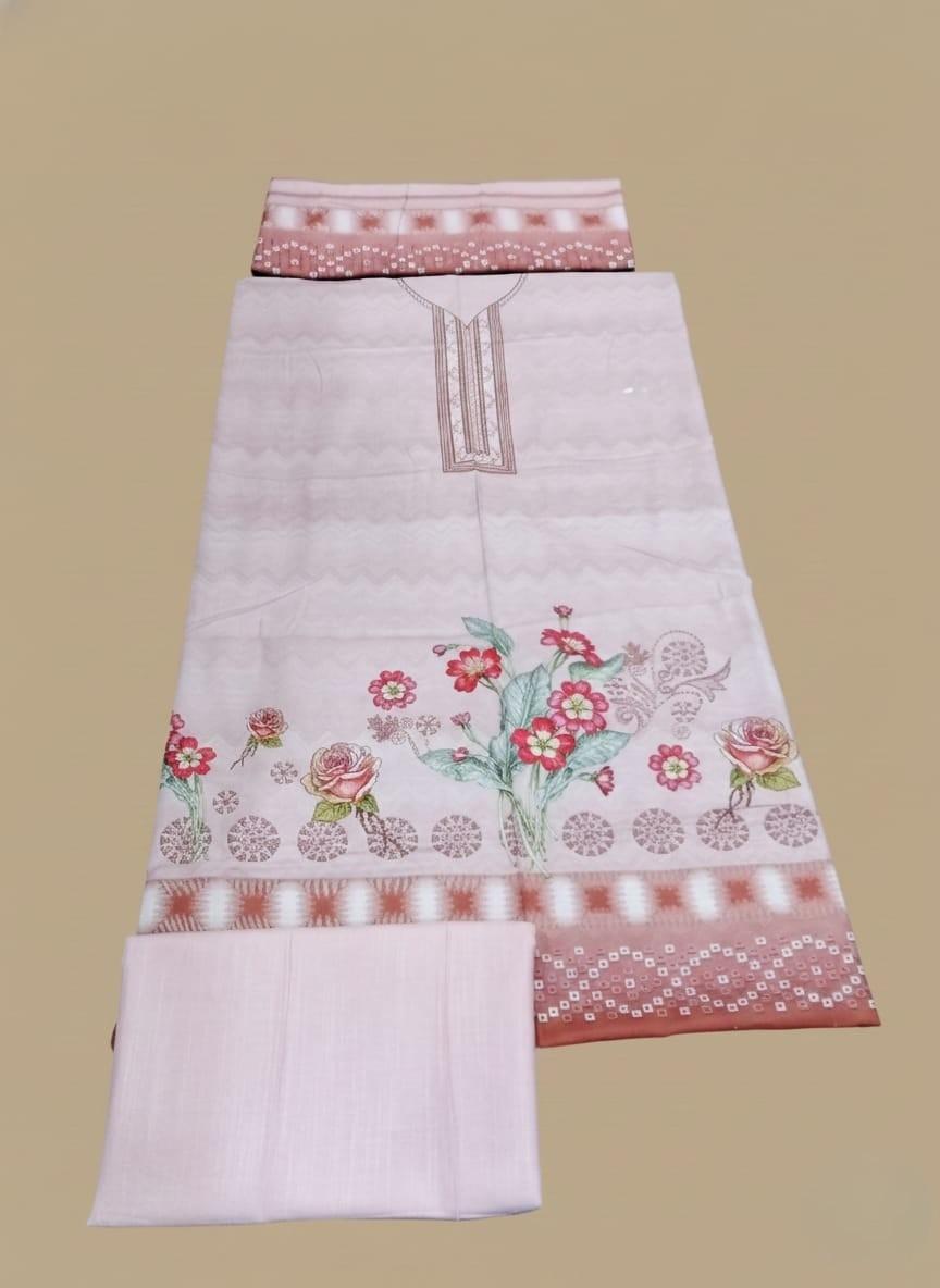 3-piece unstitched Printed Khaddar Suit. Features a warm and durable khaddar fabric, an attractive print (e.g., in winter colors), and a plain matching trouser. Ideal winter ethnic wear.