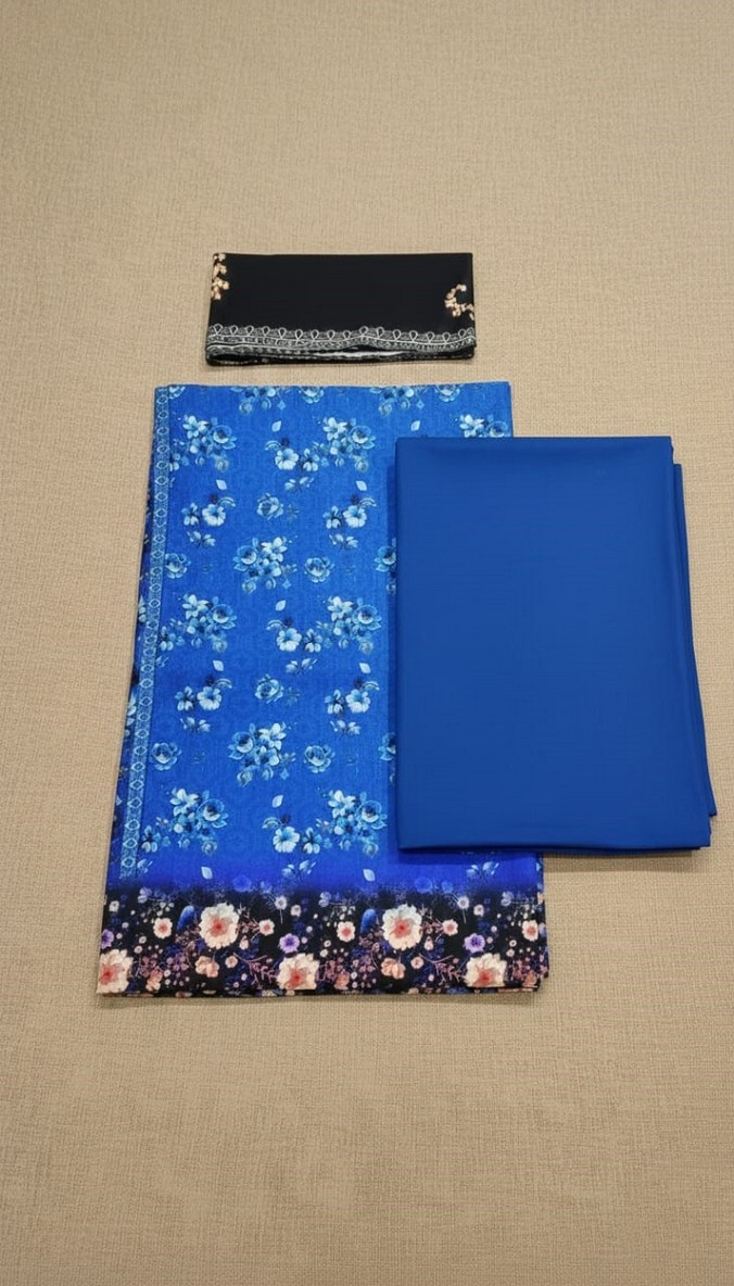 “RAS BHARI AALAYA” Women’s Blue Digital Print Winter Suit, Volume 03. Features a fancy slub digital print top with floral patterns, a black digital print dupatta, and plain trousers. Perfect for winter elegance and comfort.