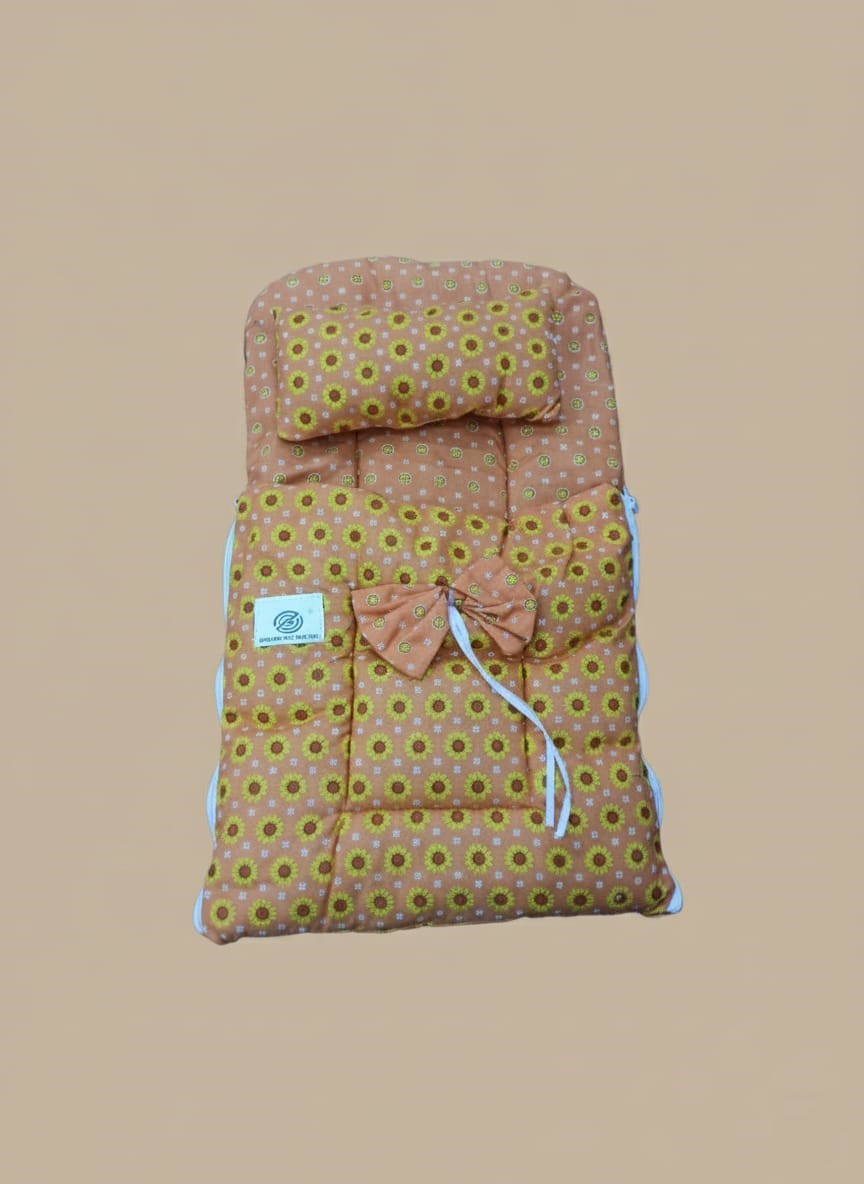 Keep your baby cozy and comfortable with this soft baby sleeping bag featuring a charming sunflower print. Designed with high-quality cotton fabric, this baby sleeping bag ensures warmth and breathability, making it ideal for all seasons. The attached pillow provides extra support for your baby’s head, while the secure tie closure keeps your little one snug and safe.