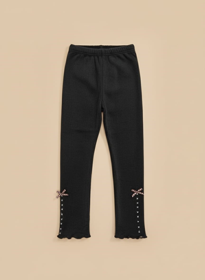 Stylish black ribbed baby leggings with cute bow details and delicate ankle stitching. Soft, stretchy, and comfortable for infants and toddlers, perfect for any outfit.