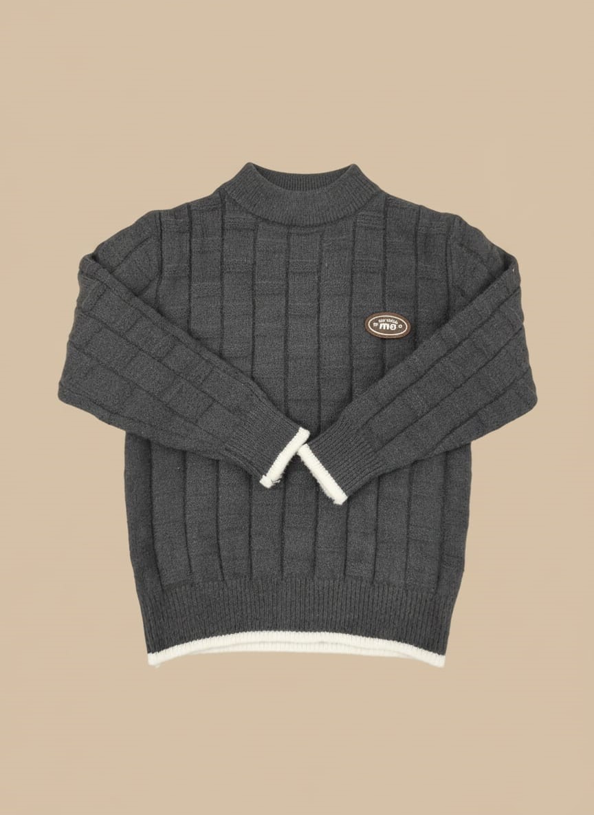 Elevate your little one’s wardrobe with our stylish Boys Knit Sweater, perfect for smart casual occasions and everyday warmth. This sophisticated boys’ sweater features a classic charcoal grey hue with a subtle textured grid pattern, adding a touch of modern flair. Crafted from a comfortable and soft knit fabric, it ensures your child stays cozy during cooler weather. The mock neck design offers extra warmth and a polished look, while the contrasting white trim at the hem peeks out for a trendy layered effect. Complete with a subtle badge detail on the chest, this versatile boys knit sweater pairs perfectly with jeans, chinos, or trousers. A durable and fashionable choice, combining comfort, quality, and timeless style for your young gentleman.