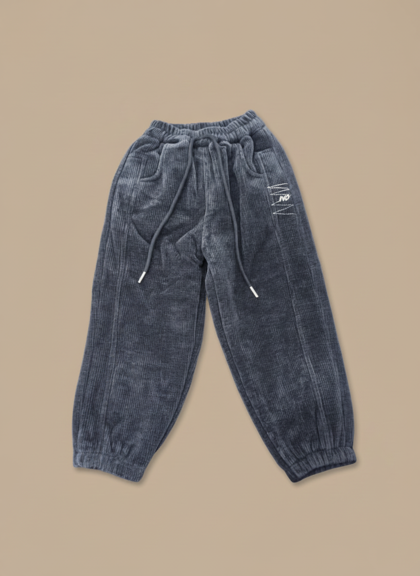 Stylish grey kids corduroy joggers with an adjustable drawstring waist and cuffed ankles. Soft, durable, and comfortable for active boys and girls, perfect for everyday wear.