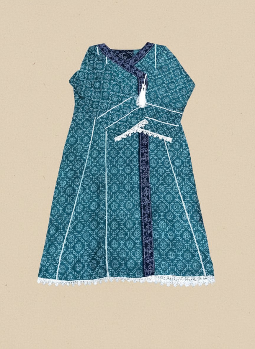 Discover our stylish teal printed khaddar Angrakha suit for women. This comfortable, ready-to-wear three-piece features an Angrakha style kurta with intricate prints, lace trim, matching khaddar trousers, and a coordinating dupatta, perfect for any occasion.