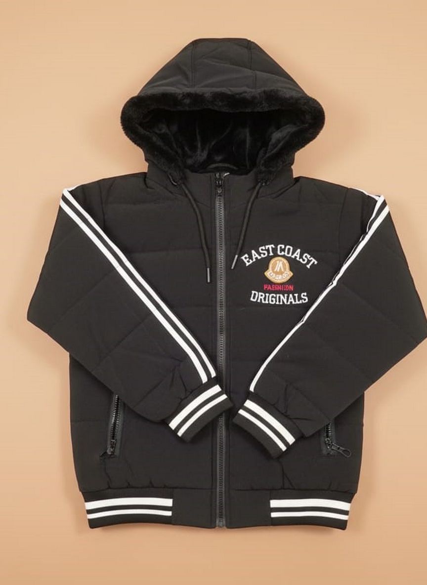 Keep your young adventurer warm and stylish with our durable Boys Puffer Jacket! This essential black hooded coat is designed to provide excellent insulation during colder months, making it perfect for outdoor activities and everyday wear. Featuring a bold “EAST COAST ORIGINALS” graphic on the chest, this boys puffer jacket adds a cool, urban edge to any outfit. The ribbed cuffs with white stripes not only offer a snug fit to keep out the chill but also add a sporty varsity touch. Complete with a full-zip front and a cozy hood, this versatile jacket is ideal for layering over sweaters or shirts. A must-have for any boy’s winter wardrobe, combining superior warmth, practical design, and undeniable style.
