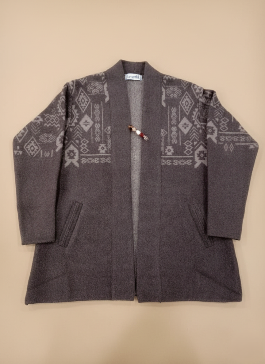 Luxurious alpaca blend sweater for women, featuring an open-front design with striking geometric artisan knit patterns and practical pockets. Experience cozy warmth and unique style with this versatile alpaca sweater.