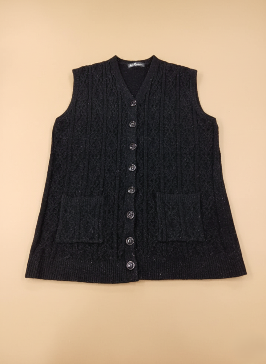 Elevate your layering game with this classic women’s black cable knit sweater vest, designed for both style and comfort. Crafted with intricate cable knit patterns, this sleeveless sweater offers a sophisticated touch to any outfit. It features a full button-front closure, allowing for versatile styling – wear it open over a blouse or buttoned up as a standalone top. The two practical front pockets add functionality and a casual flair, perfect for keeping small essentials handy. Made from a soft and warm blend, this black knitted sweater vest is an ideal transitional piece for cooler weather or as an extra layer in the office. Its timeless design ensures it pairs effortlessly with jeans, skirts, or tailored trousers, making it a must-have addition to your wardrobe. Discover the comfort and elegance of this versatile sleeveless sweater.