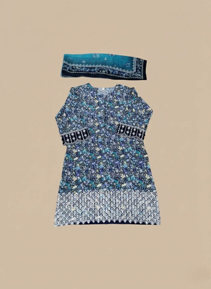 Women’s Blue Floral Printed Lawn Suit with Dupatta