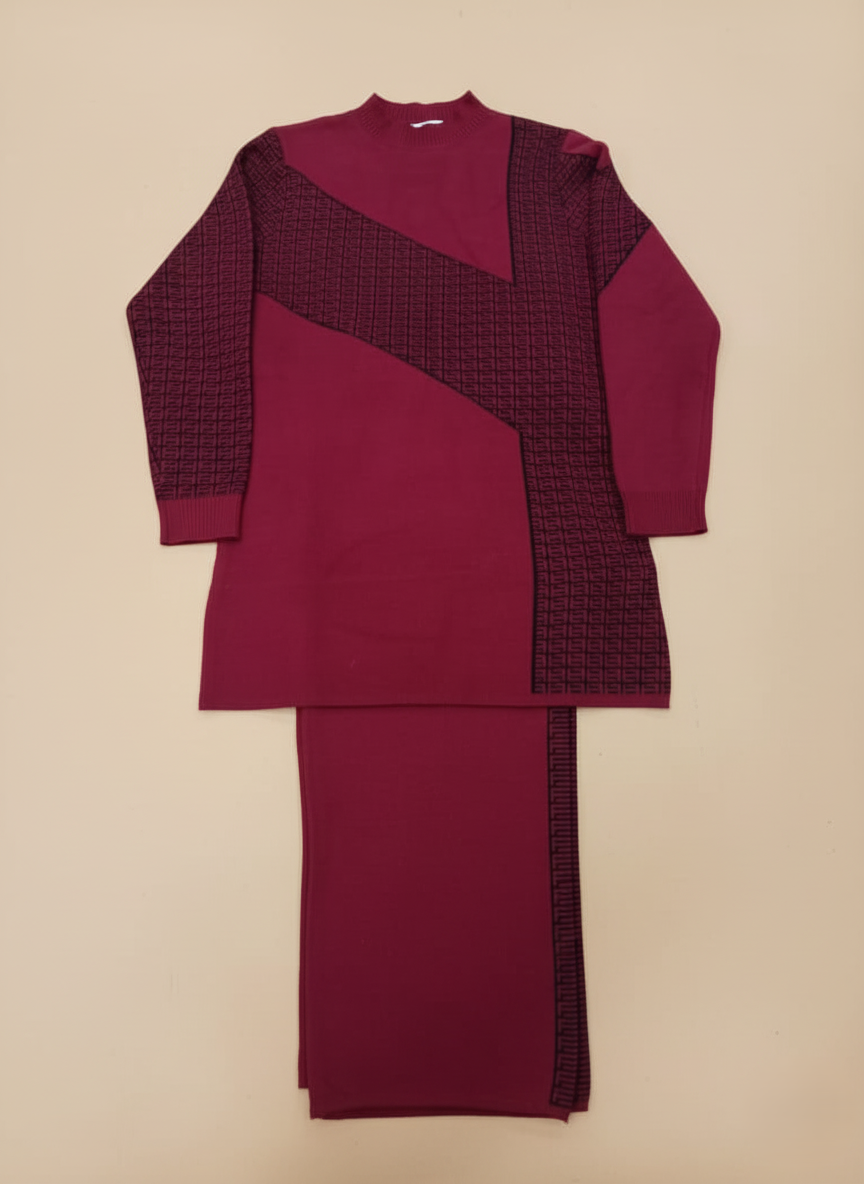 Sophisticated Women’s Burgundy Geometric Knit Sweater and trouser Set. This stylish two-piece outfit features a long-sleeved sweater with a modern geometric pattern and a matching midi skirt, offering comfort and elegance for any occasion.