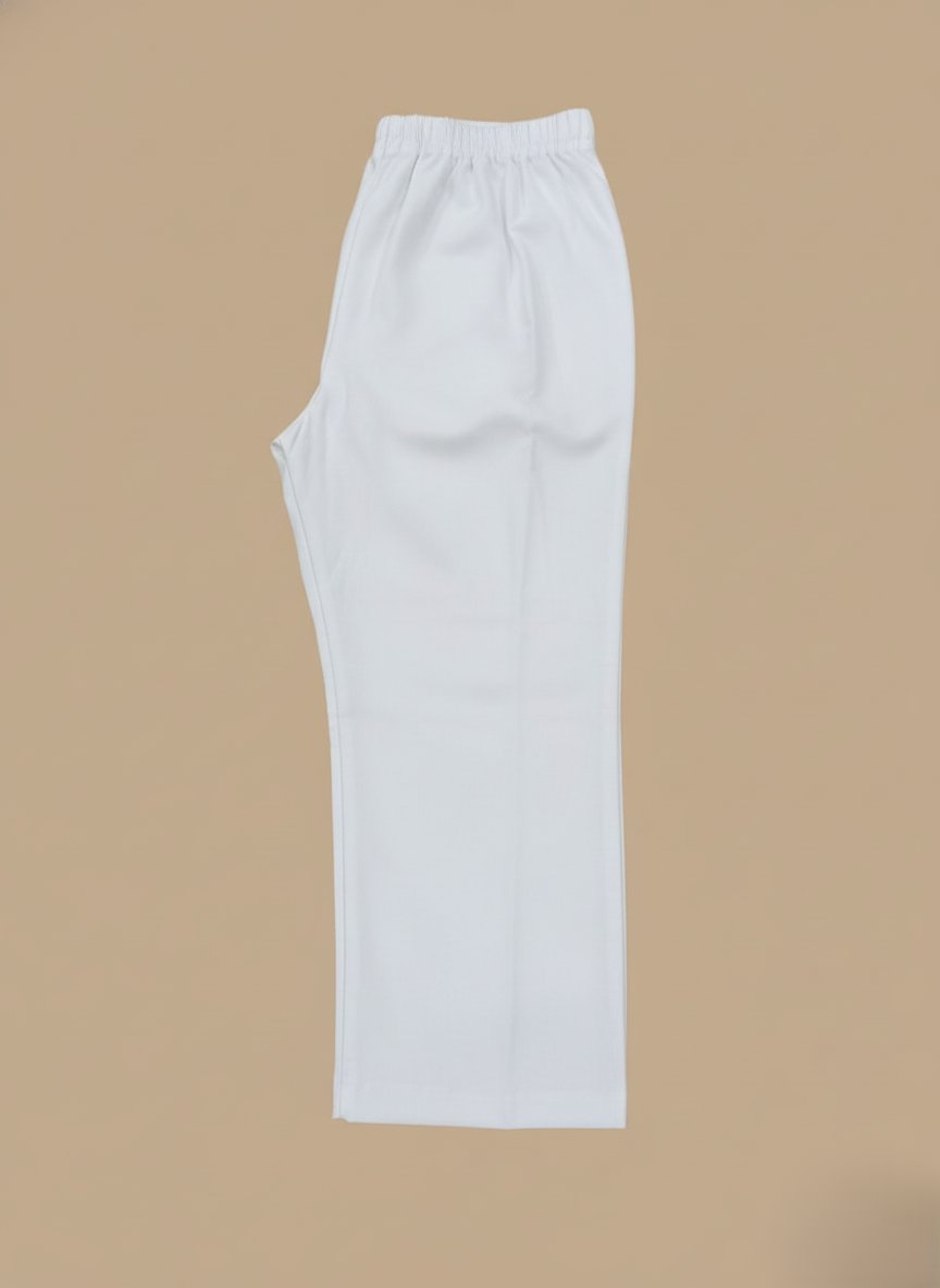 Comfortable and durable white uniform pants with an elastic waist, perfect for professional wear. Designed for both men and women, offering a flexible fit and easy care.