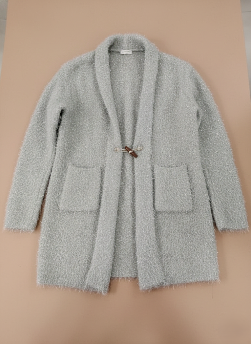 Stay warm and stylish with our Fuzzy Knit Sweater, designed for ultimate comfort and elegance. This cozy grey sweater features a unique and charming toggle closure that adds a touch of sophistication to its relaxed silhouette. Crafted from a soft, fuzzy knit fabric, it provides a subtle shimmer, making it perfect for both casual outings and dressier occasions. The open-front design drapes beautifully, offering a flattering fit for all body types, while the two practical front pockets add functionality. This versatile piece can be layered over your favorite tops and dresses, making it a must-have addition to your wardrobe. Elevate your everyday look with this luxurious fuzzy sweater.
