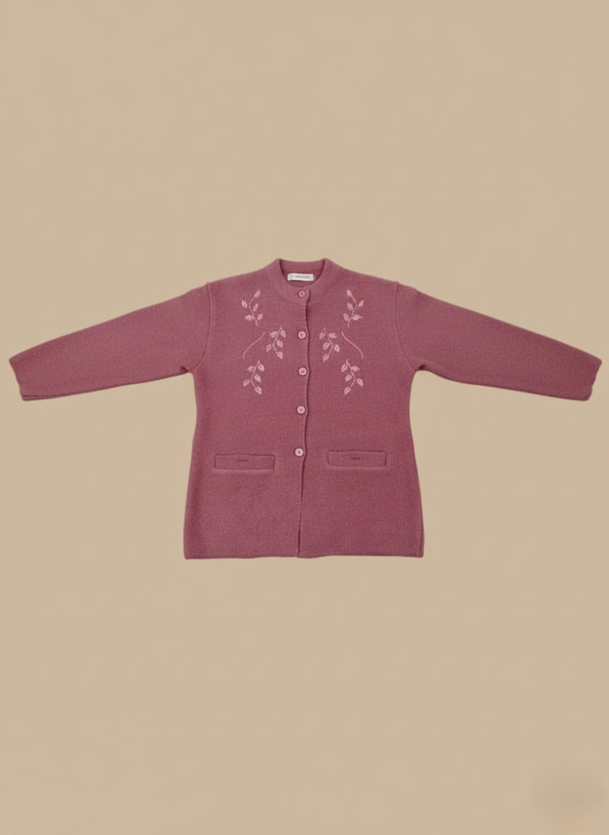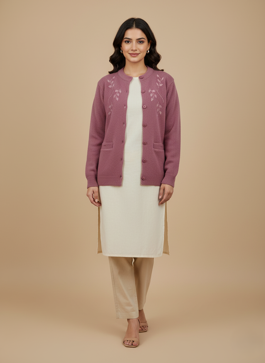 Discover timeless elegance and cozy comfort with our Women’s Dusty Rose Embroidered Knit Sweater. This beautifully crafted sweater is designed for the modern woman who values both style and warmth. Made from a soft, high-quality knit fabric, it offers a comfortable classic fit that’s perfect for layering or wearing on its own. The dusty rose hue adds a subtle pop of color, while the intricate tonal leaf embroidery on the front provides a unique and feminine touch. Functional front pockets are integrated seamlessly into the design, offering convenience without sacrificing style. With its button-down front, this women’s knit sweater is versatile enough for casual outings, office wear, or even a cozy evening at home. Experience the perfect blend of fashion and function with this essential addition to your sweater collection.