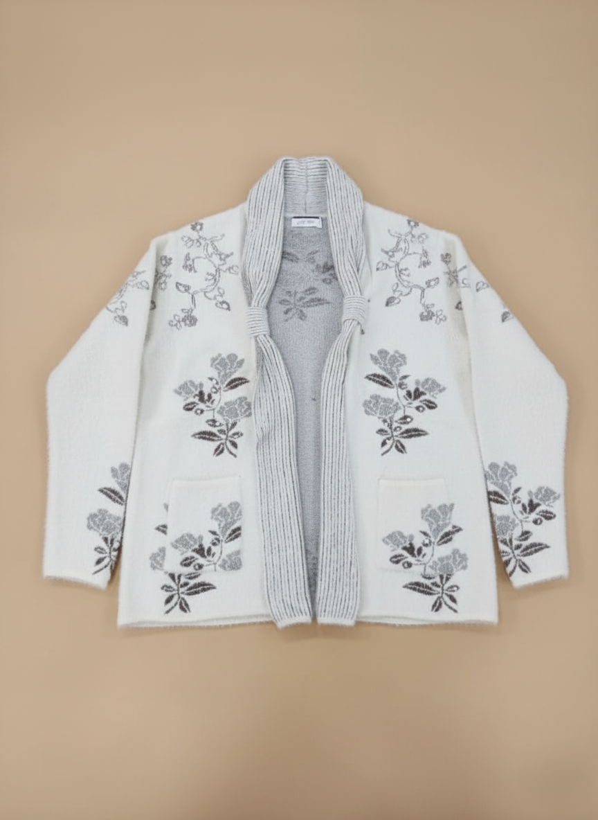 Step out in style and comfort with our exquisite Women’s Elegant Floral Knit Cardigan Sweater. This cozy open-front sweater is a perfect blend of warmth and chic design, making it an essential addition to your wardrobe. Crafted from a soft, high-quality knit, it features intricate floral patterns that add a touch of sophistication and charm. The relaxed fit and long sleeves provide ultimate comfort, while the open front design allows for easy layering over your favorite tops. Whether you’re heading to the office, enjoying a casual outing, or simply relaxing at home, this versatile floral knit sweater offers both elegance and coziness. Available in a beautiful ivory hue with contrasting grey floral embroidery, it’s designed to complement various styles and occasions. Elevate your everyday look with this must-have women’s sweater.