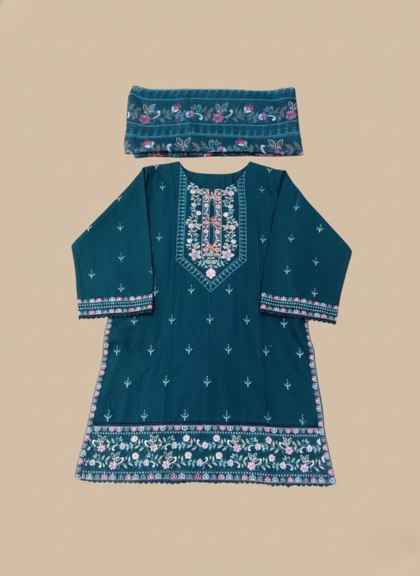 Step out in elegance and comfort with our exquisite Women’s Embroidered Cotton Teal Suit. This beautiful 3-piece ensemble, crafted from premium quality cotton, offers a breathable and soft feel perfect for any season. The rich teal color is beautifully complemented by intricate embroidery featuring delicate floral patterns on the neckline, sleeves, and hem of the kurta. The matching trousers provide a comfortable fit, while the coordinating dupatta, also adorned with detailed embroidery, adds a touch of traditional charm.