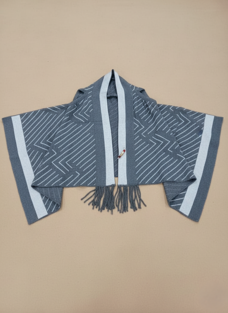 Wrap yourself in stylish comfort with our Women’s Hooded Knit Sweater Shawl, a versatile and chic addition to your wardrobe. This elegant grey sweater features a captivating geometric stripe pattern in a contrasting light grey, adding a modern touch to a classic silhouette. Crafted from a soft and cozy knit fabric, it’s perfect for layering on cooler days or adding a fashionable edge to any outfit. The integrated hood provides extra warmth and a casual flair, while the playful fringe detailing at the front adds a bohemian charm. The wide, flowing sleeves offer a relaxed fit, making this women’s hooded sweater an ideal choice for both lounging and stepping out. Elevate your style with this unique and comfortable hooded shawl.