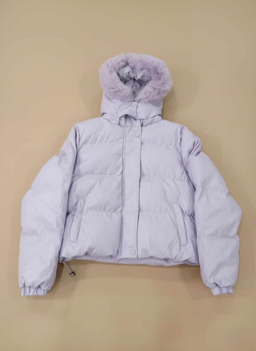 Stay cozy and chic in our lilac puffer jacket. Featuring a soft faux fur hood and a trendy cropped design, this warm winter coat is perfect for adding a pop of color to your cold-weather wardrobe.