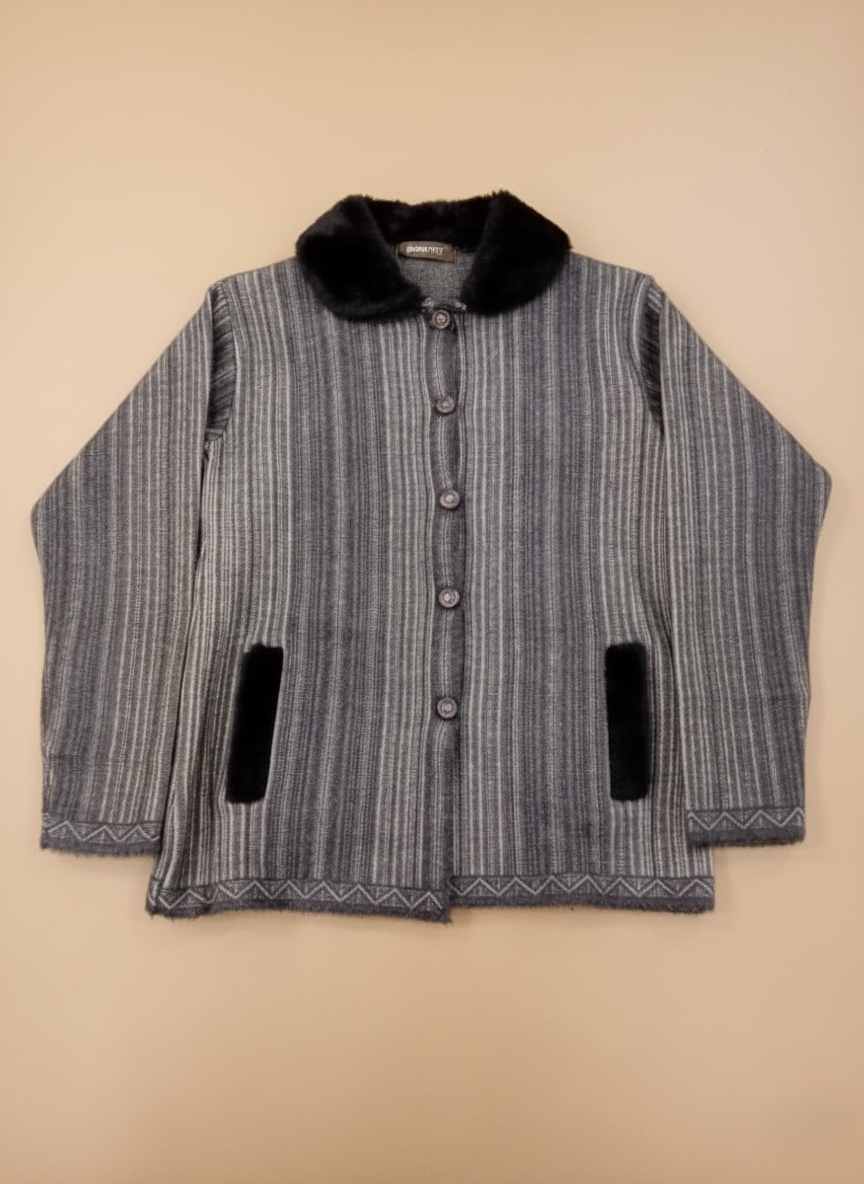Embrace unparalleled comfort and timeless style with our exquisite women’s alpaca blend button-front sweater. Crafted from a soft, high-quality alpaca mix, this sweater promises exceptional warmth and a gentle feel against your skin, making it an ideal choice for cooler weather. The elegant design is enhanced by a plush faux fur collar that adds a touch of luxurious sophistication, while the two integrated faux fur pockets offer both functionality and a chic detail. Its classic button-front closure allows for versatile styling – wear it open over a top or buttoned up for a polished look. The vertical striped pattern in varying shades of grey creates a slimming effect and adds visual interest, ensuring this alpaca sweater stands out in your wardrobe. Perfect for casual outings, office wear, or a cozy evening in, this versatile alpaca sweater is a must-have for any fashion-conscious woman seeking comfort, quality, and style.