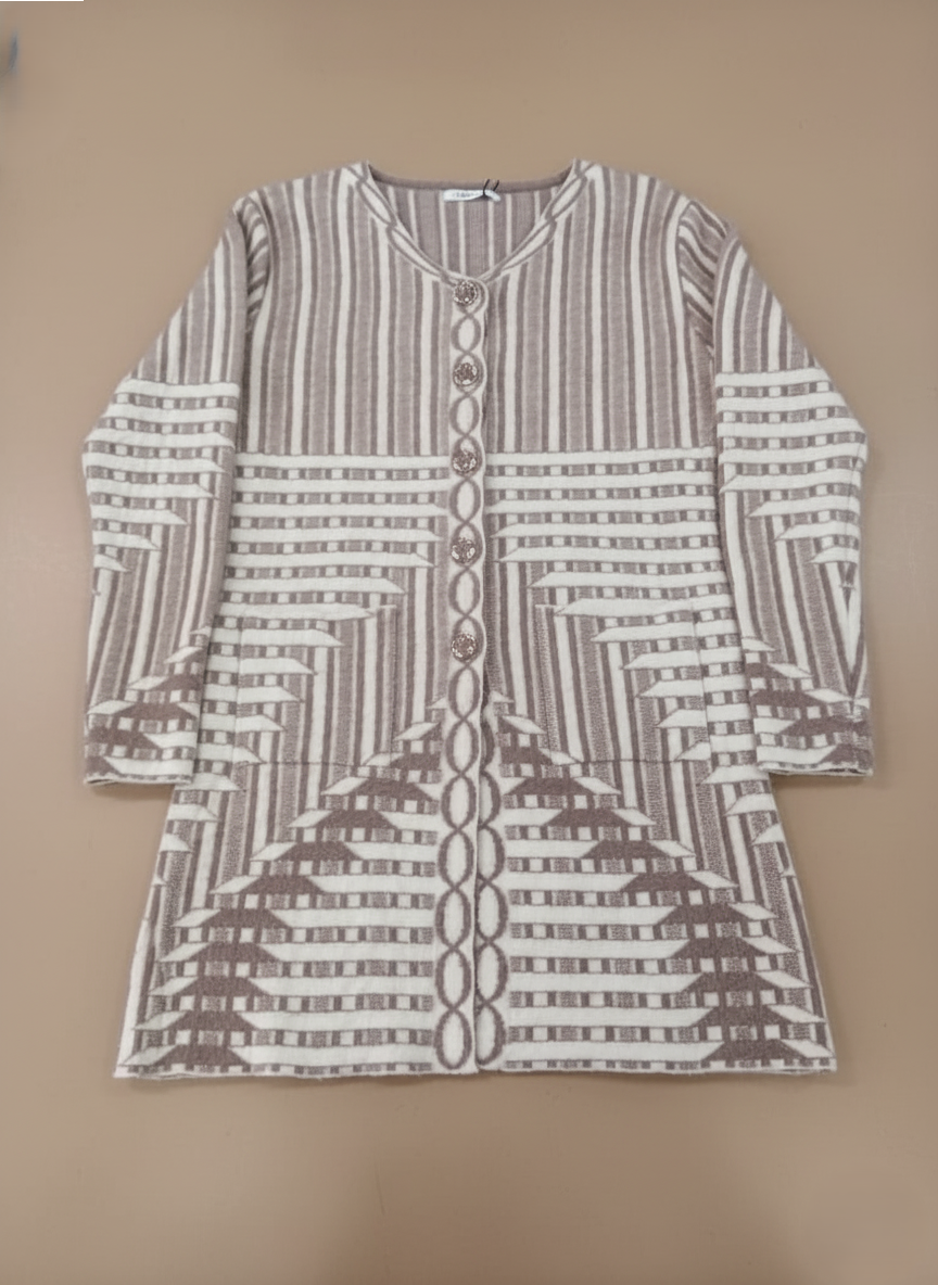 Step out in style and comfort with our elegant Women’s Patterned Knit Cardigan Sweater. This cozy button-front design is perfect for adding a touch of sophistication to any outfit. Crafted from a soft, high-quality knit fabric, it features a unique geometric pattern in a beautiful neutral color palette, making it a versatile addition to your wardrobe. The long sleeves and comfortable fit ensure warmth and ease of movement, ideal for layering during cooler seasons or as a chic standalone piece. With its intricate detailing and practical button closure, this women’s patterned sweater offers both fashion and functionality. Elevate your everyday look with this must-have knitwear.