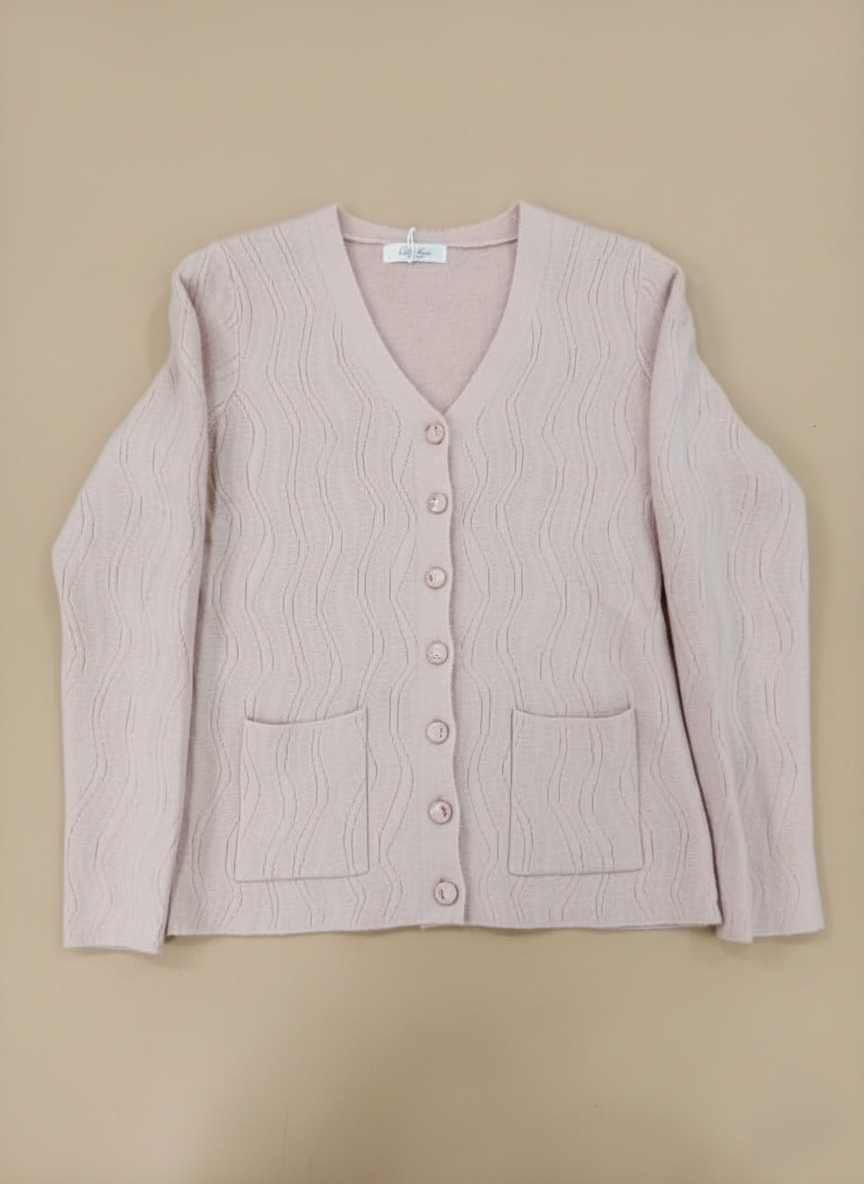 Elevate your wardrobe with our versatile women’s ribbed knit cardigan sweater. Crafted from a soft, comfortable fabric, this stylish v-neck sweater boasts a delicate wave-like ribbed pattern that adds a touch of sophistication. The full button-front closure allows for easy wear, whether you prefer to wear it open as a light jacket or buttoned up for extra warmth. Two practical front pockets offer convenience and a casual flair. Its beautiful light pink hue makes it an ideal layering piece for any season, effortlessly transitioning from casual outings to more polished ensembles. Pair this elegant sweater with jeans for a relaxed look or over a dress for a cozy, chic outfit. A must-have addition to any woman’s collection, ensuring comfort and style.