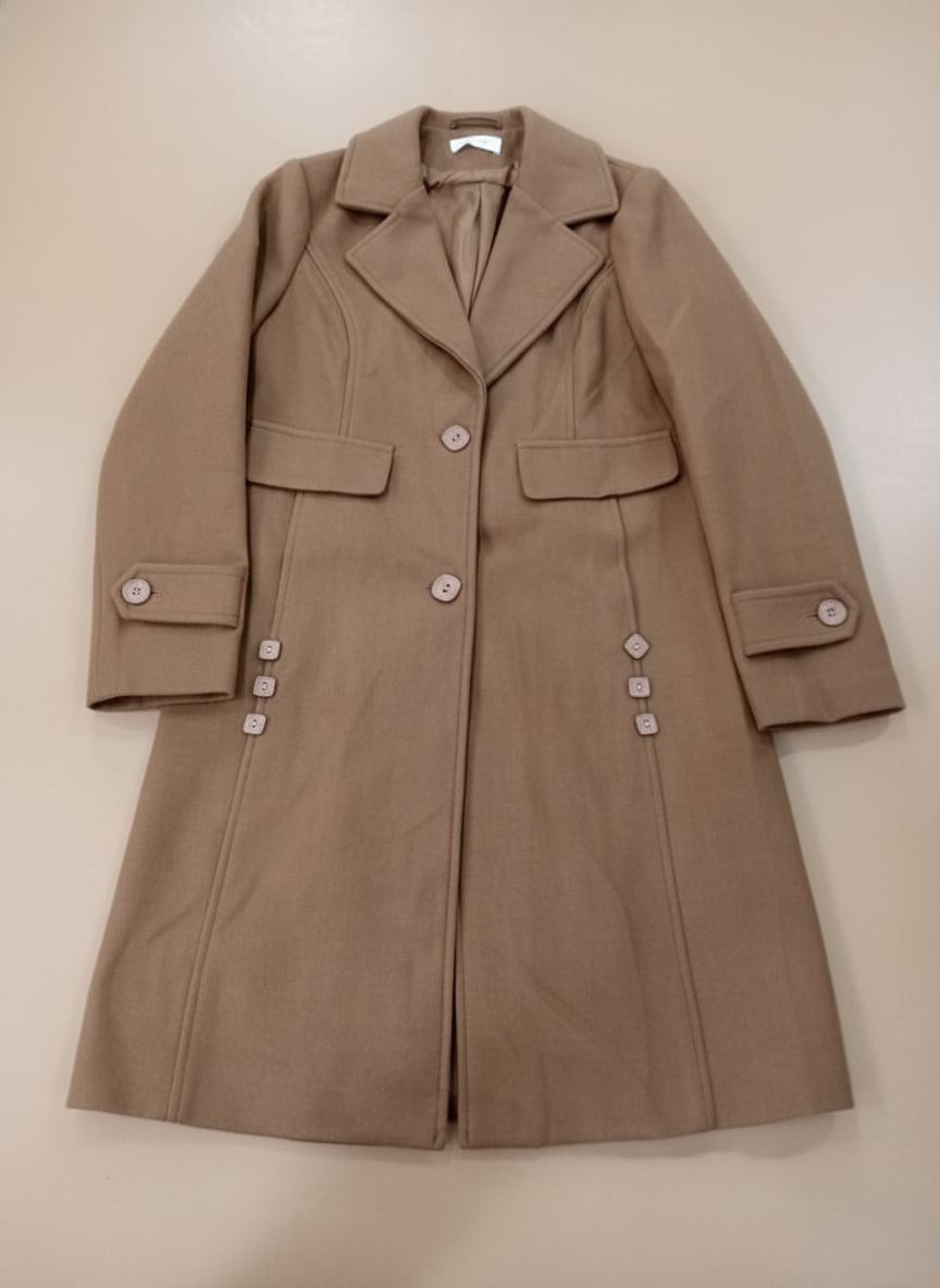 Elegant camel women’s wool blend single-breasted trench coat with notched lapels and decorative buttons. Perfect for classic style and warmth.